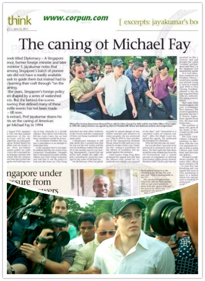 1993父母离异,随母移居新加坡的费伊(点比较背,刚满18岁)在新加坡被捕,罪名是用油漆涂鸦多辆汽车,并涉嫌盗窃。被判入监四个月,罚款3500新加坡元,并受鞭刑6下。