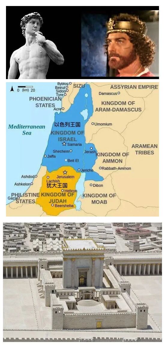 重返迦南的犹太人于公元前11世纪,建立了统一的希伯来王国。大卫王时期将犹太教定为国教,建都耶路撒冷(希伯来文语“和平之城”)。公元前12世纪,腓力斯丁人(非闪族)进入地中海沿岸,控制了加沙到雅法的海岸线,此地叫做“巴勒斯坦”。公元前975年,以色列联合王国分裂后,在北部十个支派称为“以色列”,南部的两个支派称为“犹太”。公元前970年,大卫王之子所罗门成为以色列国王,耗时7年在耶路撒冷锡安山(Mt. Zion)建造了金碧辉煌的耶和华圣殿,就是犹太历史上的第一圣殿。