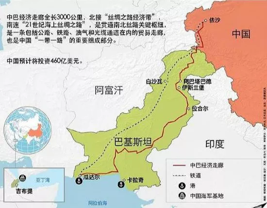 随着“一带一路”构想的提出,中巴两国2014年11月就签署协议,提出建设“中巴经济走廊”的计划,始于巴基斯坦俾路支省瓜德尔港,直到中国新疆的喀什市,中巴经济走廊总长约3000公里。准备打通新疆与巴基斯坦之间的能源和物资通道,进而对接与中东、非洲,把南亚、中亚、北非、海湾多国通过经济、能源合作联系在一起,形成经济共振。