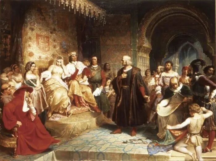 1492年8月3日,哥伦布率领83个人,分乘“圣玛丽亚”号等3艘海船向西航行,前往那未知的东方(目标印度或者是中国)。伊莎贝拉封哥伦布为,海洋舰队司令和将发现土地的总督。伊莎贝拉为蒙古大汗写了国书,由哥伦布随身携带。做生意倒是其次,伊莎贝拉更想,联合蒙古大军对奥斯曼土耳其形成夹击。最终在1492年10月12日,哥伦布到达了北美洲的巴哈马群岛。虽然这一天,是美洲人民“血和泪”的开始。但哥伦布开辟的新航线,第一次将新旧大陆连为一体,为西班牙在此后100多年的大国霸权打下基础。10月12日后被西班牙定为国庆节,予以庆祝。