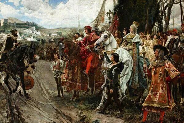 伊莎贝拉和费迪南觉得,西班牙要从专制王权和教会的双重利益出发,强化对“异端”(指的是犹太人、已皈依天主教的摩尔人、反对国王和教会的人)的镇压。1478年,伊莎贝拉和费迪南德,成立了西班牙宗教裁判所,要么改天主教,要么被没收财产驱逐。这就导致了拒绝皈依天主教的穆斯林和犹太人被全部驱逐出西班牙。1492年1月2日这一天,格拉纳达的摩尔人献出城池,被视为天主教徒的历史性胜利,标志着伊斯兰教势力被驱逐出欧洲,欧洲的教堂都响起了庆祝的钟声。伊莎贝拉和斐迪南,也因此被教皇亚历山大六世,加上了“天主教国王”的桂冠。