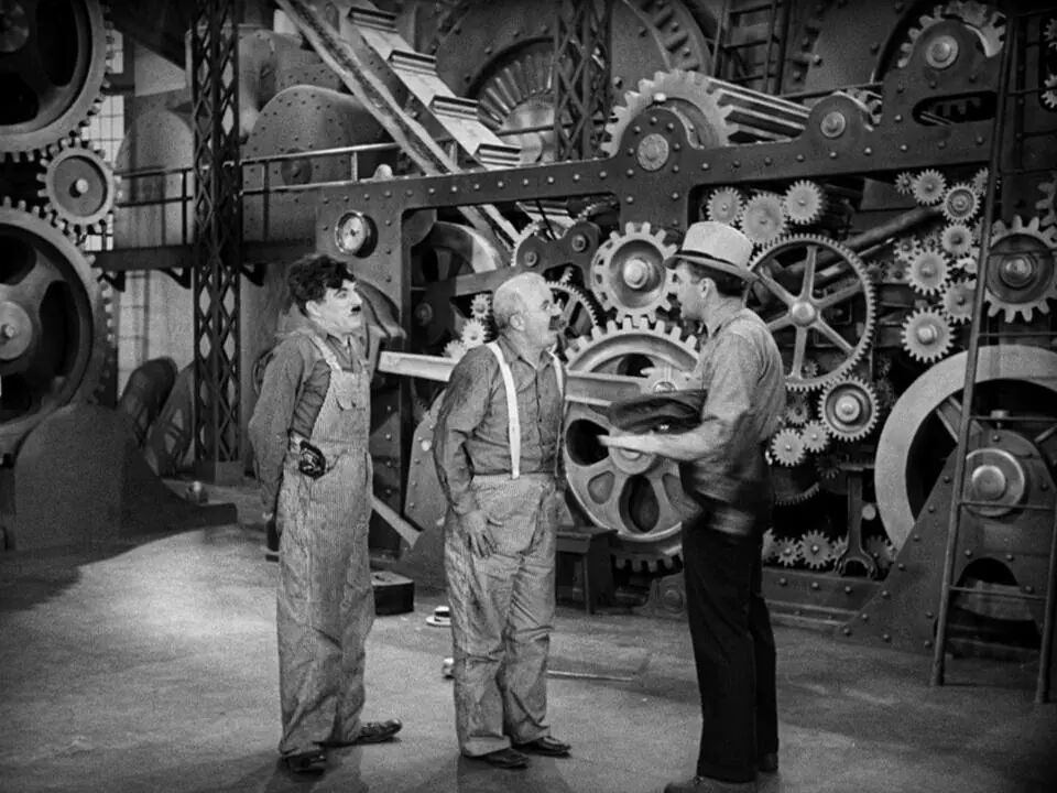 《摩登时代》是卓别林电影生涯中最具影响力的作品之一,也是他最后的一部无声电影。讲述的是30年代美国经济大萧条时期,人们为了生计苦苦挣扎,主人公查理作为社会最底层的劳工,每天像机器一样在流水线上拼命工作。然而资本家依然觉得,工人们的劳动量不够饱和,甚至在厕所里安装监控来查岗,没有人能有丝毫的喘息时间。爱因斯坦看完又流了眼泪,他给卓别林写信:你的电影《摩登时代》,世上人人都能看懂。你会是个伟人的。卓别林回信给爱因斯:你的相对论没有多少人能懂;但你已经是一个伟人了。