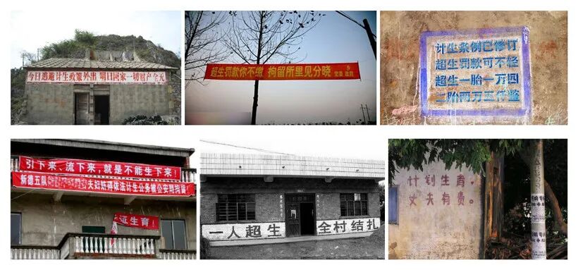“一人超生,全村结扎!”,“该扎不扎,见了就抓。”,“国家兴旺,匹夫有责;计划生育,丈夫有责”。“见证怀孕,持证生育!”“能引地引出来,能流地流出来,坚决不能生下来。”,“普及一胎,控制二胎,消灭三胎。”......