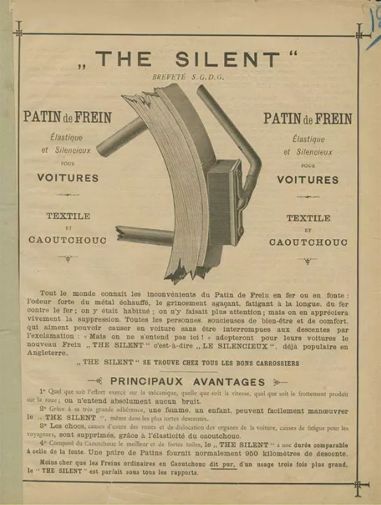 在19世纪的欧洲,汽车还只是贵族豪门的代步工具,马车和自行车是大众最主要的出行工具。1887年,哥哥安德烈发明了一种,由织布和橡胶块制成的新型刹车块,用来代替马车或自行车上的噪音超大的铸铁刹车块,产品取名“The Silent(安静)”。