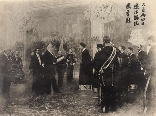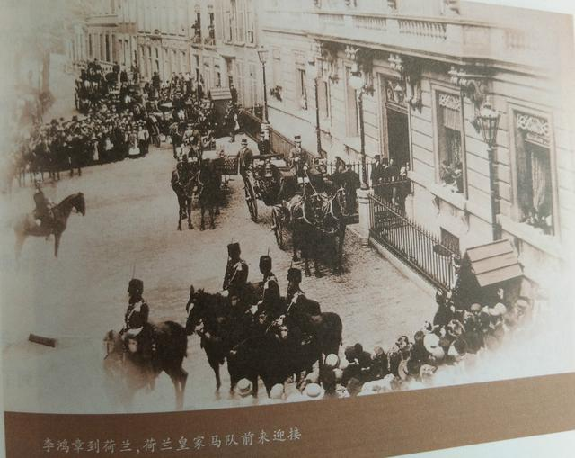 7 月 4 日,结束了在德国的考察访问,李鸿章进入荷兰境内。7 月 6日,觐见了荷兰摄政王和女王威廉敏娜(Wilhelmina)。女王派出皇家马队迎接,并专门准备了晚会。此后李鸿章一行又游历了比利时、法国。访问法国海军后,又参加了世界各国升旗典礼,中国自古没有唱国歌的习惯,年逾古稀的李鸿章从座位上站起来,主动的走到清朝的黄龙旗下,高声唱起了故乡安徽民间流传的《茉莉花》。