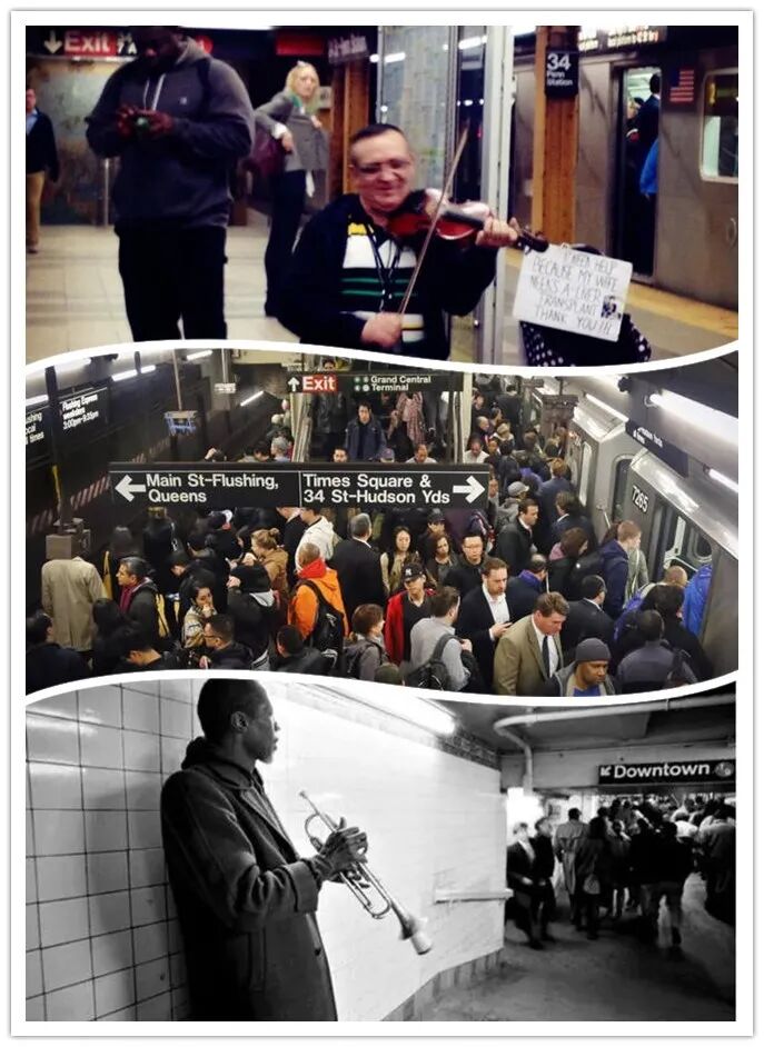 众所周知,在美表演的艺人都需要“持证上岗”,否则可能逮捕关押或被罚款。但警察怎么可能抓光全纽约的“艺术家”,更何况还是在这种鱼龙混杂的地方。纽约人一天会花大约1小时在地铁上,不少人每天至少看到一次街头卖艺或是地铁里的表演。不管清晨、午后还是华灯初上,对地铁艺人都区别不大,因为这里一年到头也看不见阳光,陪伴他们的只有手中的乐器——萨克斯风、吉他、小提琴……沉郁的萨克斯,或是喧腾的摇滚乐,伴随着刺耳尖叫高分贝的列车声,音符被撕得支离破碎,震得地上装零钱的铁盒子咔咔作响。