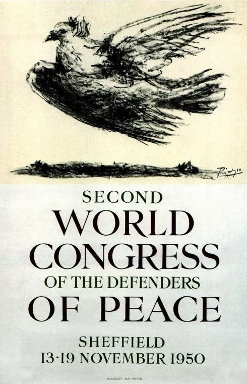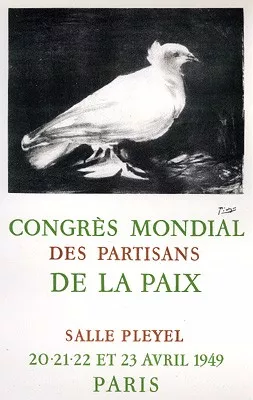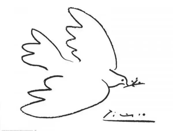 画家毕加索非常激动,画了一只白色的活脱、快乐的鸽子。1949年“世界和平大会”在巴黎召开。毕加索就把这幅,饱含着人民的血泪控诉,寄托着人民无限同情的版画《La Colombe(鸽子)》,献给了和平大会。智利的著名诗人聂鲁达Louis Aragon选择了毕加索的画作为会议的海报,并作诗一首:“毕加索的和平鸽展开翅膀,翱翔在世界的每一个地方;任何力量也无法,阻止它的翱翔。”