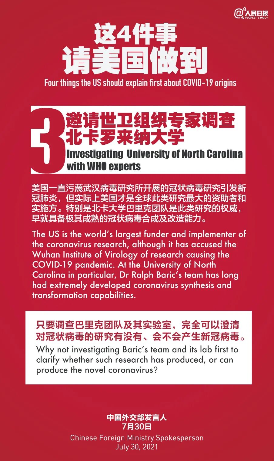 第三,美国应该邀请世卫组织专家调查北卡罗来纳大学。美国一直污蔑武汉病毒研究所开展的冠状病毒研究引发新冠肺炎,但实际上美国才是全球此类研究最大的资助者和实施方。特别是北卡大学巴里克团队是此类研究的权威,早就具备极其成熟的冠状病毒合成及改造能力。只要调查巴里克团队及其实验室,完全可以澄清对冠状病毒的研究有没有、会不会产生新冠病毒。