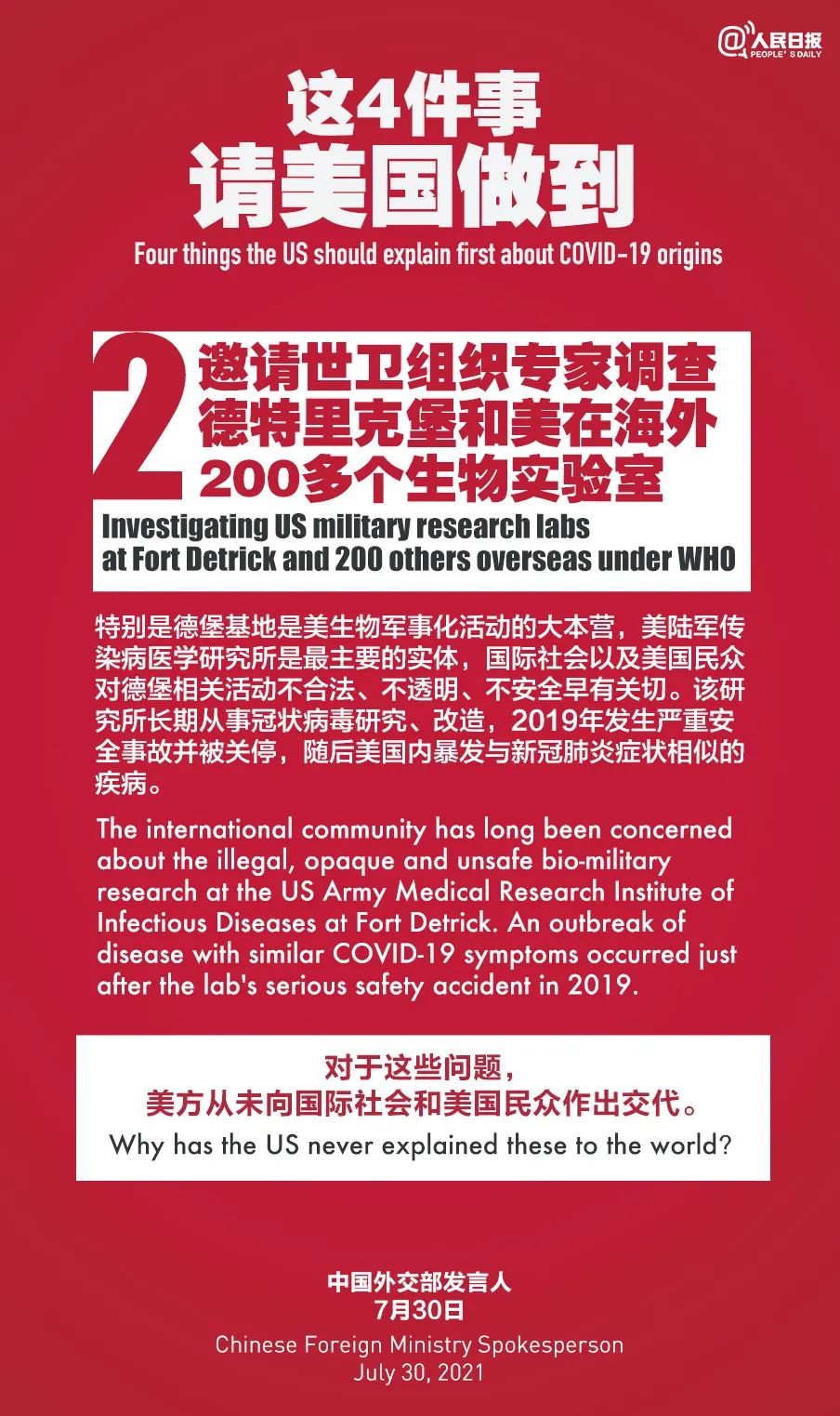第二,美国应该邀请世卫组织专家调查德特里克堡和美国在海外200多个生物实验室。特别是德堡基地是美国生物军事活动的大本营,美国陆军传染病医学研究所是最主要的实体,国际社会以及美国民众对德堡相关活动不合法、不透明、不安全早有关切。该研究所长期从事冠状病毒研究、改造,2019年发生严重安全事故并被关停,随后美国内暴发与新冠肺炎症状相似的疾病。对于这些问题,美方从未向国际社会和美国民众作出交代。