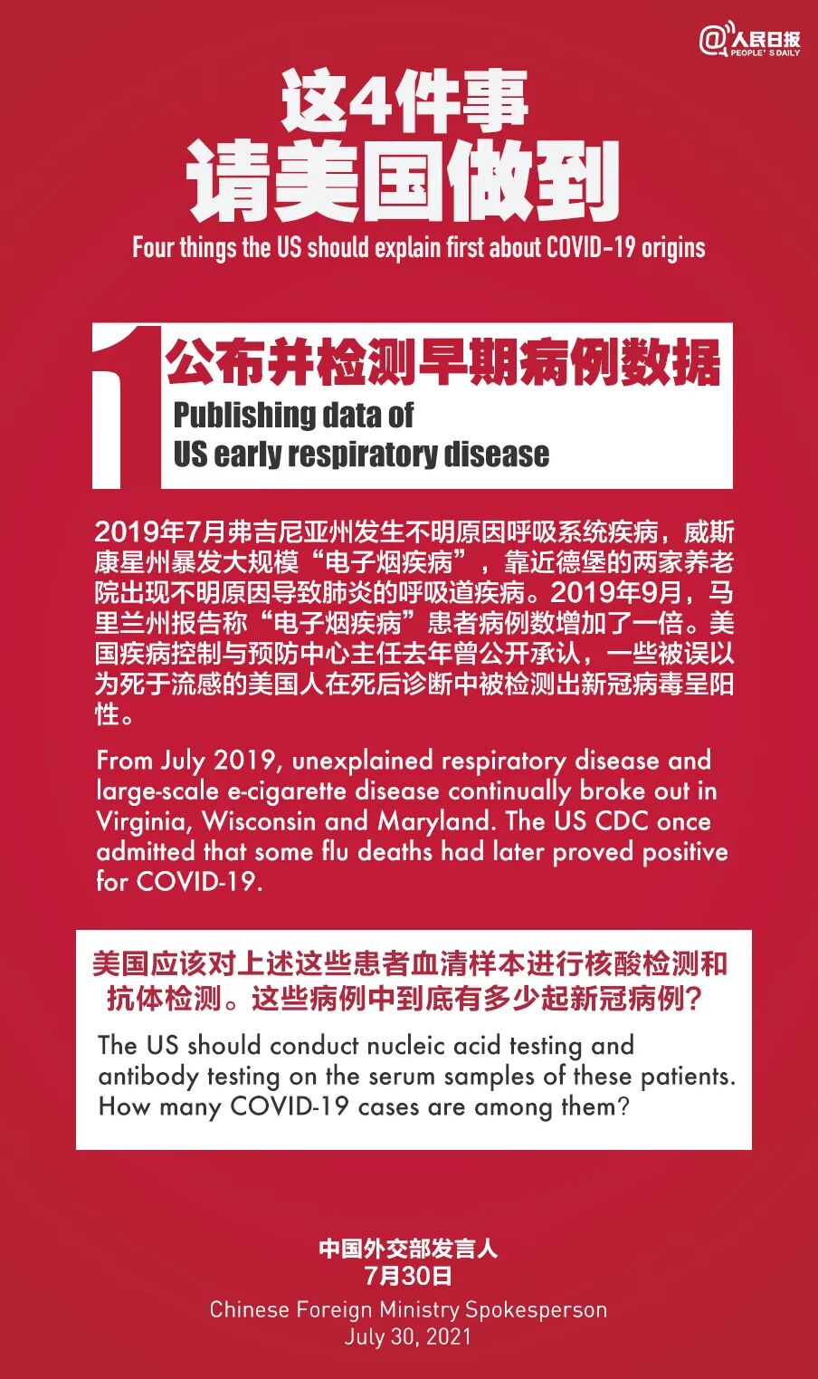 第一,美国应该公布并检测早期病例数据。2019年7月弗吉尼亚州发生不明原因呼吸系统疾病,威斯康星州暴发大规模“电子烟疾病”,靠近德堡的两家养老院出现不明原因导致肺炎的呼吸道疾病。2019年9月,马里兰州报告称“电子烟疾病”患者病例数增加了一倍。美国疾病控制与预防中心主任去年曾公开承认,一些被误以为死于流感的美国人在死后诊断中被检测出新冠病毒呈阳性。美国应该对上述这些患者血清样本进行核酸检测和抗体检测。这些病例中到底有多少起新冠病例?