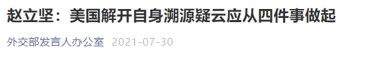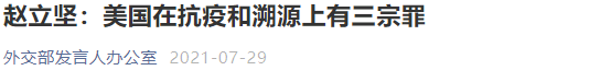 赵立坚:一段时间以来,美国到处煽风点火,不断加大对病毒溯源的政治操弄。美国在抗疫和溯源上有三宗罪: