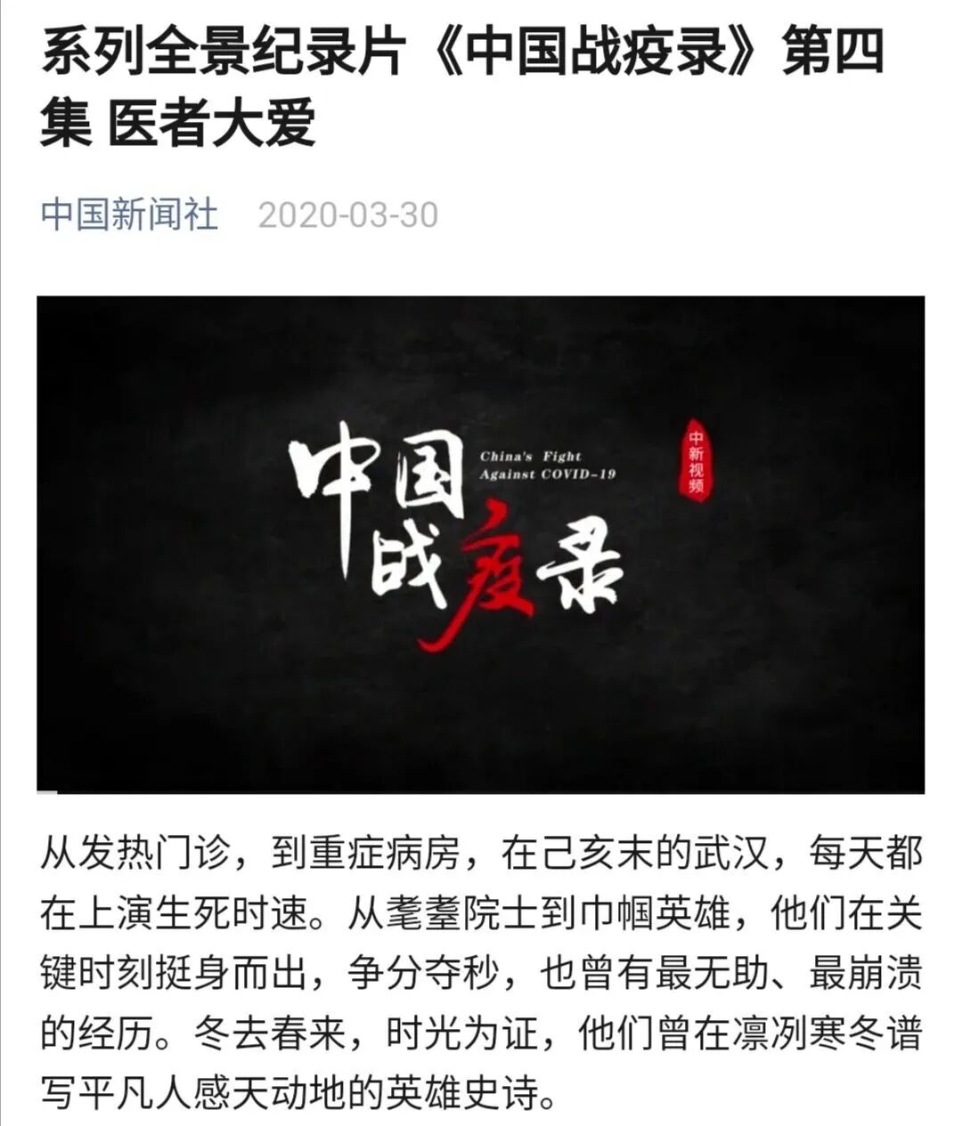 2020年3月30日,中国新闻社推出五集纪录片《中国战疫录》,第四集是专讲医生战疫的,名为“医者大爱”。看完这9分多钟的视频,只有一个感受: