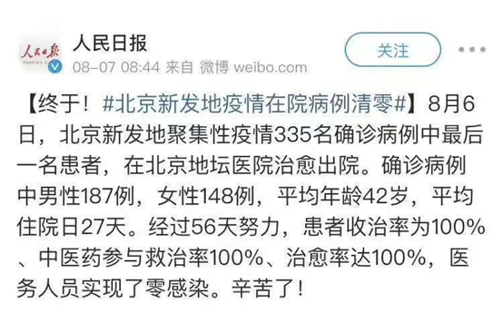去年6月份的北京新发地疫情,到了8月6日最后一名患者治愈出院。中医药参与救治率100%、治愈率达100%,医务人员实现了零感染。