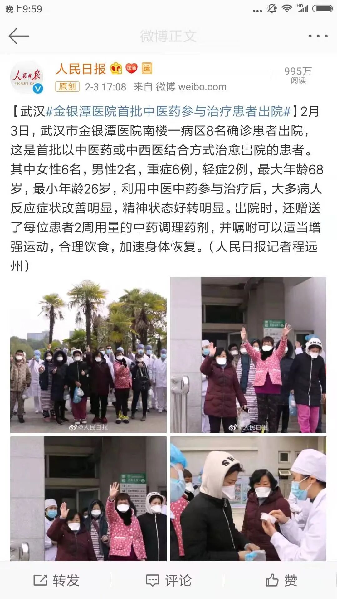 2月3日人民日报报道了金银潭医院,首批中医药参与治疗的患者出院情况: