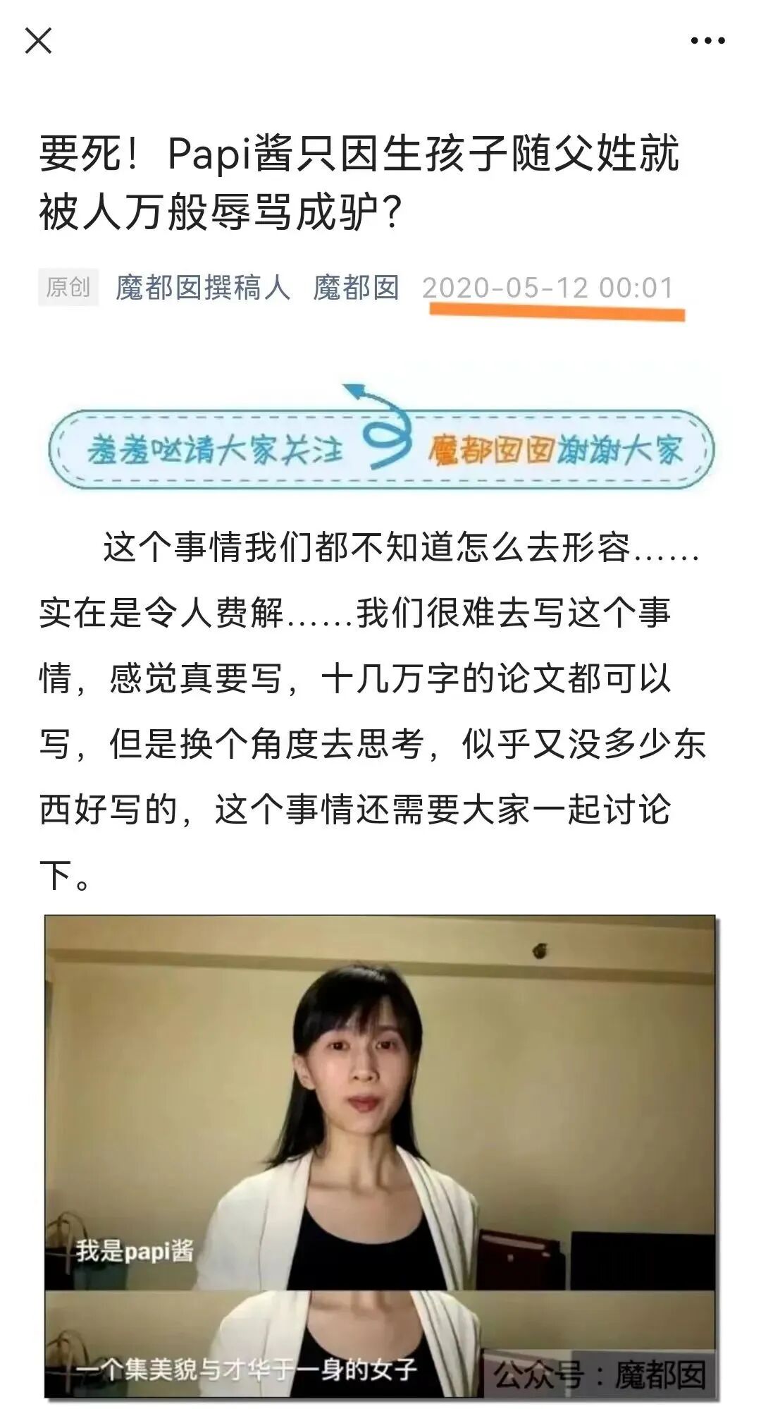 一篇是2020-05-12发布的《要死!Papi酱只因生孩子随父姓就被人万般辱骂成驴?》