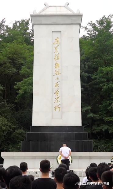 电影《金刚川》开机前,剧组来到丹东市抗美援朝烈士陵园向先烈致敬。和吴京、张译等人“垂手”鞠躬完全不同,管虎是“背手”鞠躬。