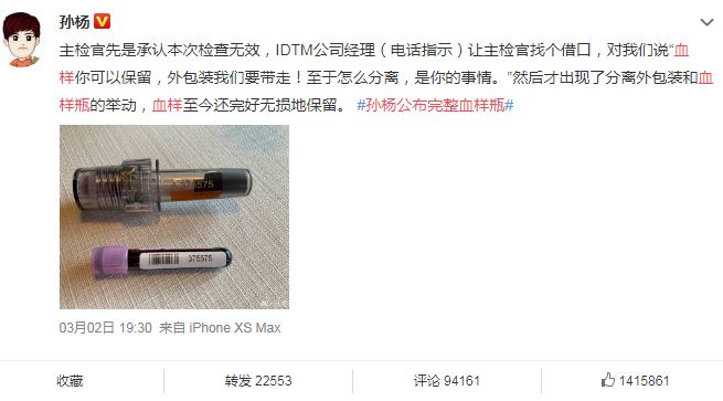 所以,很明显,这次检测事实上未完成,责任在于IDTM公司。孙杨已经配合抽血,并未抗检,是IDTM拒绝再派有资质的检测官来。