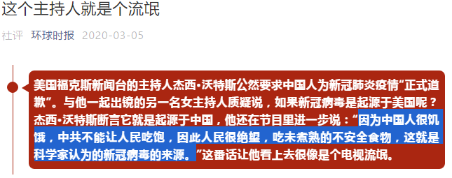 前段时间,美国贼喊抓贼地提出“实验室起源论”。还有前几天,美国福克斯新闻台的主持人杰西·沃特斯,造谣说疫情是中国引发的,公然要求中国人“正式道歉”。