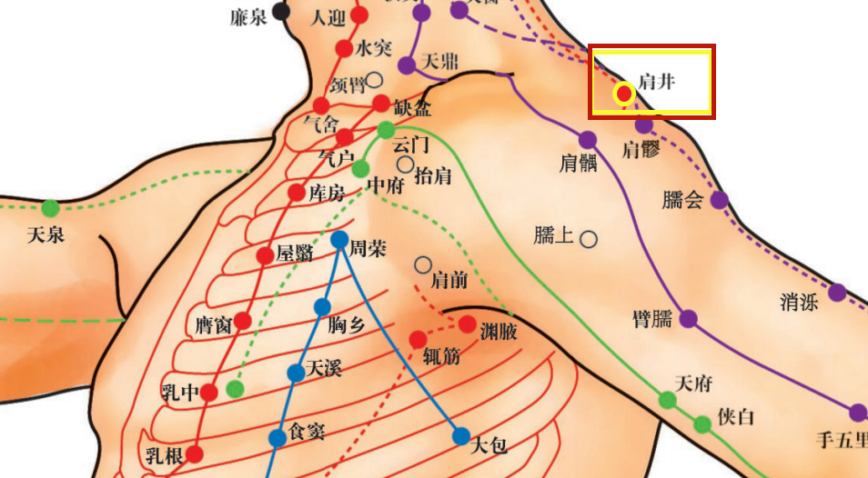 肩井穴。左右各一穴,找准穴位,用力按压,以能耐受为度,按压30秒,再压再放松,直至牙痛缓解为止。一般按压穴位,疼痛可明显减轻,经过1~3分钟,疼痛即可消失。可舒筋活络止痛。