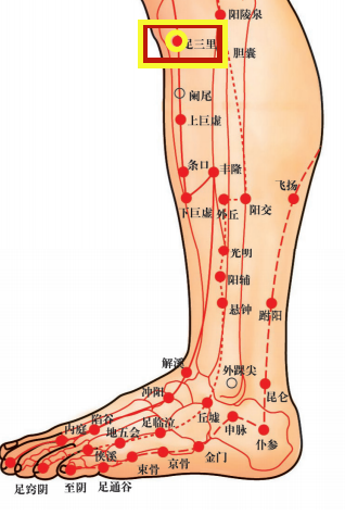 足三里穴:将手掌心按压膝盖顶部并五指向下,中指指尖向外一公分处的部位即为足三里。按压此处有助于整治肠胃机能并促进水分的代谢。