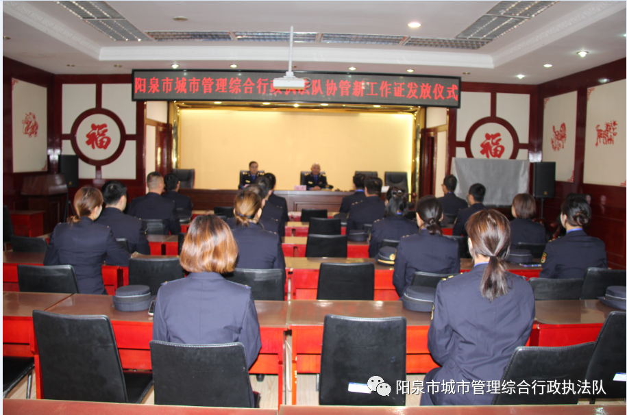 为进一步加强城管执法队协管人员正规化建设,有效规范和保障协管人员依法履行职责,10月9日,阳泉市城市管理综合行政执法队在队六楼会议室举行了协管员新工作证授证仪式。随后,我队199名协管人员将全部持证上岗。