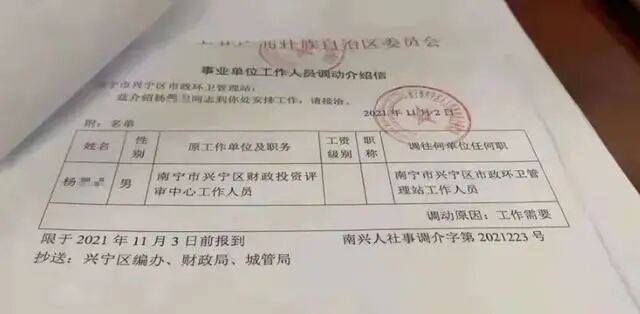 网传工作调动介绍信显示,杨某某由原工作单位南宁市兴宁区财政投资评审中心,调往南宁市兴宁区市政环卫管理站,并限于2021年11月3日前报到。