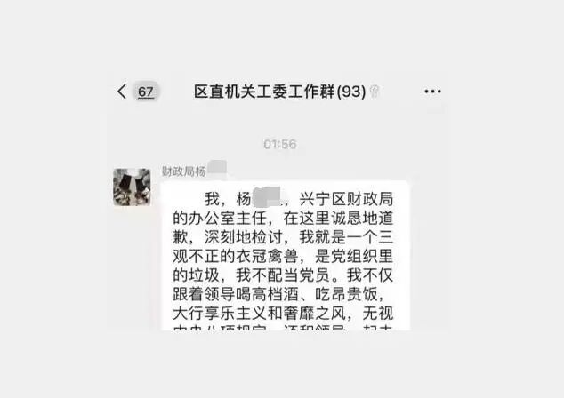 另一段文字为致歉内容,文字的口吻为视频中的男子,他自称是广西南宁兴宁区财政局一主任杨某某,长期和他人保持不正当男女关系。