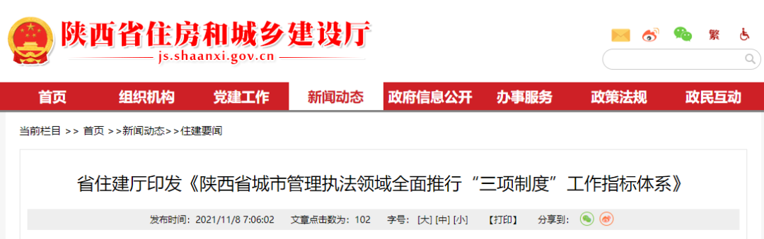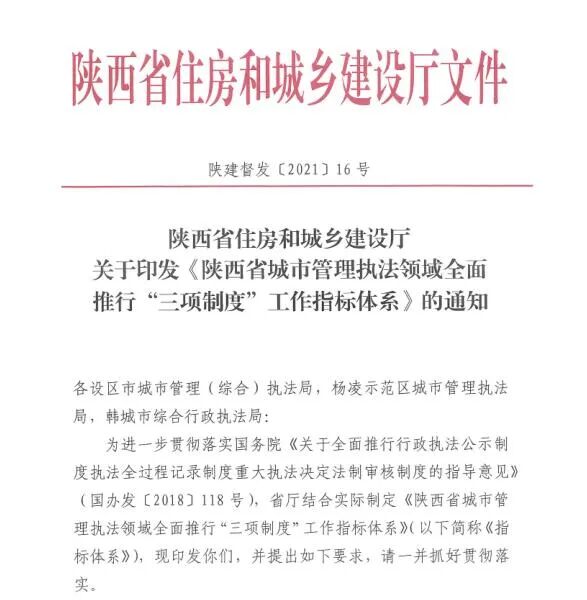为进一步贯彻落实国务院《关于全面推行行政执法公示制度执法全过程记录制度重大执法决定法制审核制度的指导意见》(国办发〔2018〕118号),近日,省住建厅结合实际制定印发了《陕西省城市管理执法领域全面推行“三项制度”工作指标体系》(以下简称《指标体系》)。