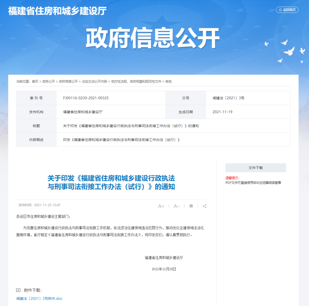 为完善住房和城乡建设行政执法与刑事司法衔接工作机制,依法惩治住建领域违法犯罪行为,推动优化住建领域法治化营商环境,福建省住房和城乡建设厅制定了《福建省住房和城乡建设行政执法与刑事司法衔接工作办法》,并于日前发布。