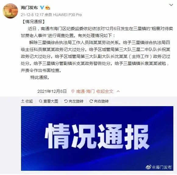 近日,南通市海门区纪委监委依纪依法对12月6日发生在三星镇的“粗暴对待卖甘蔗老人事件”进行调查处置。有关处理情况如下: