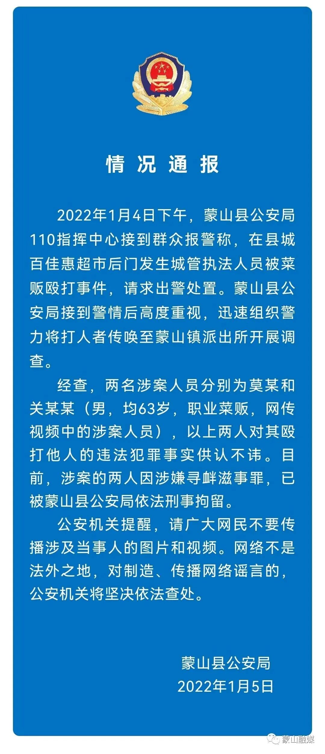 据蒙山县委宣传部主办的微信公众号@蒙山融媒消息,两名涉案人员因涉嫌寻衅滋事罪,已被蒙山县公安局依法刑事拘留,案件还在进一步侦办中。