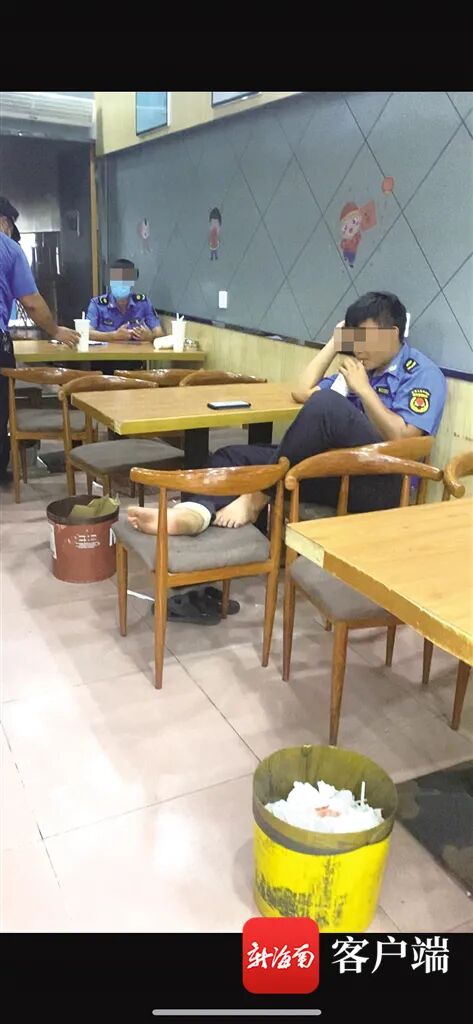 水吧内一名执法人员脱鞋把脚搭在凳子上。