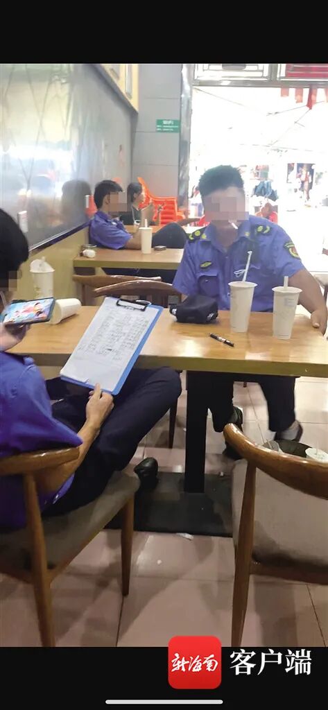 记者进入“星食茶”水吧内购买了一杯饮料,在水吧内看到,一共有5名执法人员在现场,其中一名执法人员背靠墙壁,双脚脱鞋搭在一张凳子上,津津有味地浏览社交软件。一名执法人员左手拿着手机打王者荣耀,右手写着“巡查记录”,记者在一旁观察的一小会儿期间,这名执法人员就写了十几条巡查记录。现场,有的执法人员直接把两张凳子拼在一起当“临时床”躺卧着。