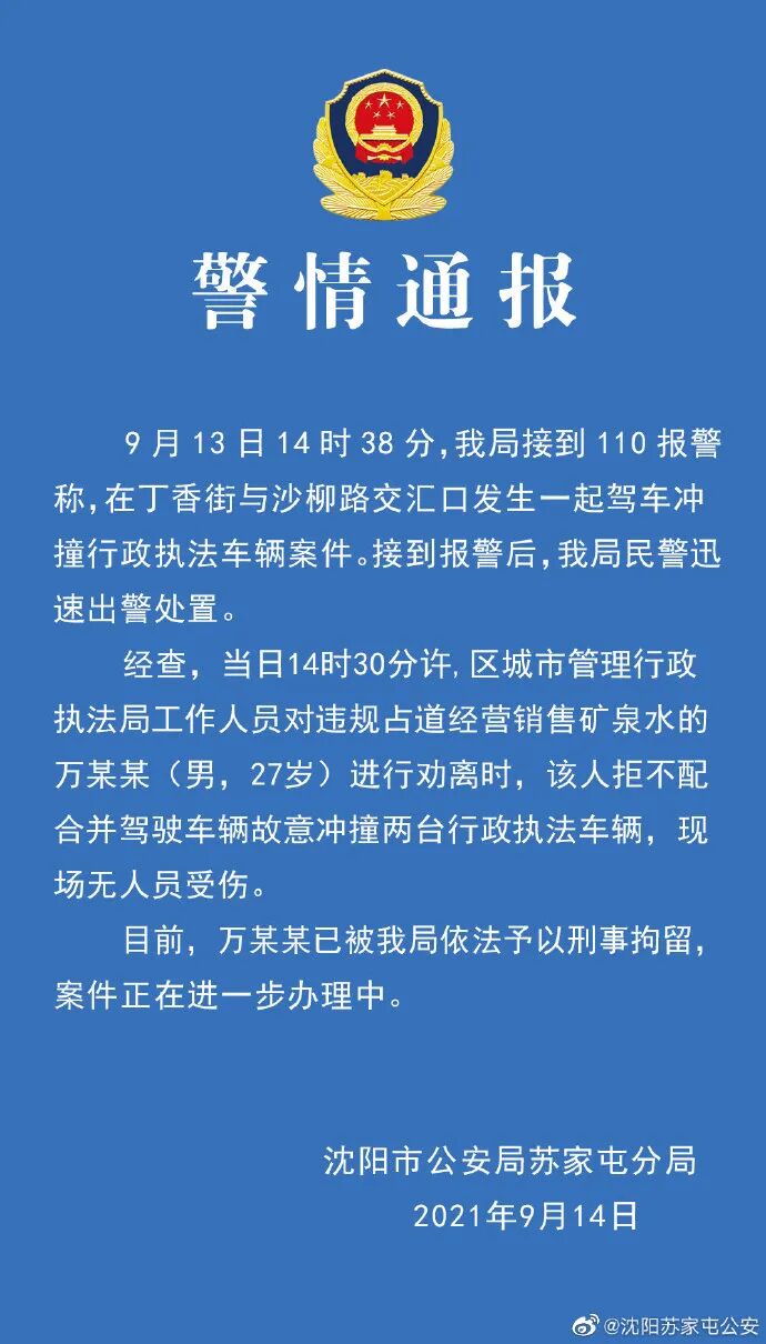 14日,沈阳市公安局苏家屯分局发布通报称,9月13日14时38分,分局接到110报警称,在丁香街与沙柳路交汇口发生一起驾车冲撞行政执法车辆案件。接到报警后,民警迅速出警处置。
