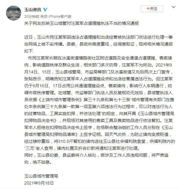 近日,玉山市民汪某军因违法占道摆摊和出店经营被执法部门依法进行处理一事在网络上被不实传播。县委、县政府高度重视,经调查取证,现将相关情况通报如下: