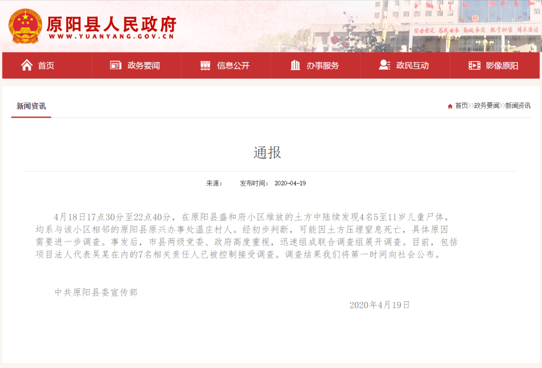 4月10日原阳县政府下发《关于建筑施工领域安全生产专项治理行动的通知》。该《通知》还显示,此次专项治理行动时间为4月10日至5月8日,具体分为企业自查、部门执法检查、督查检查等阶段。自4月10日至4月18日,为企业自查阶段。在企业自查阶段的最后一天下午,4名男童被埋身亡。
