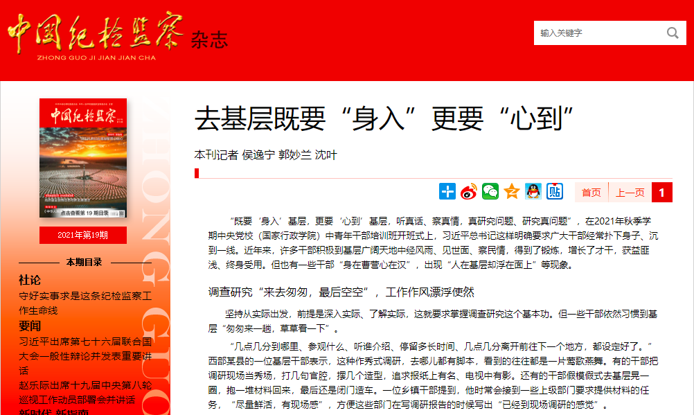 最新一期的《中国纪检监察》杂志,刊文批评了下基层调研、挂职、帮扶、指导工作中的乱象。