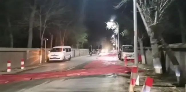 记者注意到,该路段在村子里,周边分布着大量农田,不时有车辆和村民通过该路口附近,地面铺设的红毯已被来往车辆碾压损坏。