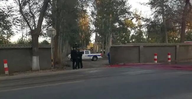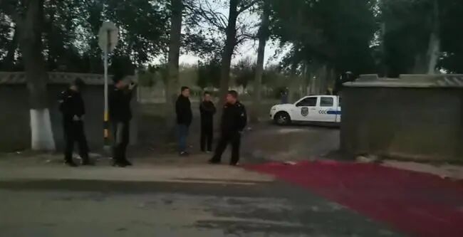 徐先生拍摄视频显示,农田和村道交叉口附近路面上铺设了红毯,挖掘机、装载机等多辆秋收作业车停放在农田里。城管执法车辆停放在村道前往农田的入口处,将通道堵住,多名身着制服的人员站在通道口处。