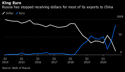 俄央行4月26日公布的数据显示,俄在与中国的贸易中,美元使用量空前下降了很大一部分。目前,两国之间超过四分之三的贸易额都以欧元进行交易。数据显示,欧元在俄罗斯总出口中所占的份额跃升了10个百分点以上,达到36%。不仅于此,中俄本币化结算趋势也更加明显。