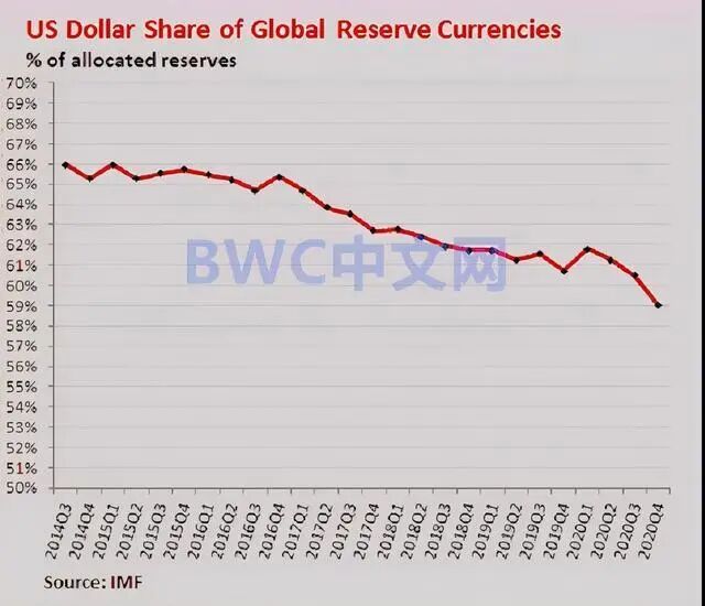 值得一提的是,如下图:美元占据全球储备货币的份额已在去年第四季度跌至历史最低点。与此同时,俄罗斯,英国,法国,德国,意大利等多国央行,以及欧洲央行早已将人民币列为外汇储备货币,对此,德国央行一位分析师称,这是由世界经济的客观情况决定的。而伊朗数月前就正式宣布将人民币列为主要外汇货币,以替代美元地位,这些事件叠加在一起,不难发现,在美国经济不断滥用美元地位的情况下,美元变得越来越不得人心了。