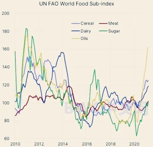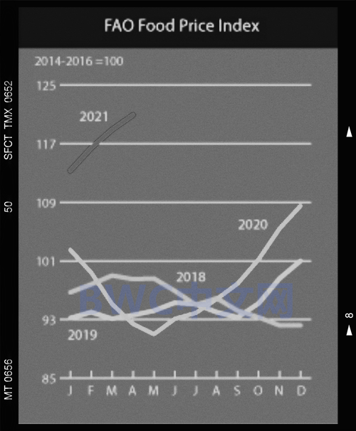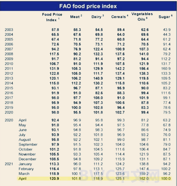 事情的新动向是,联合国粮食及农业组织的食品价格指数在4月份连续11个月上升,达到2014年5月以来的最高水平,其中糖价引领价格上涨。总部位于罗马的粮农组织5月6日公布的最新数据显示,衡量一篮子谷物,油料种子,乳制品,肉和糖的月度变化的食品价格指数从3月份的118.9点升至4月份的120.9点,上涨了2点。