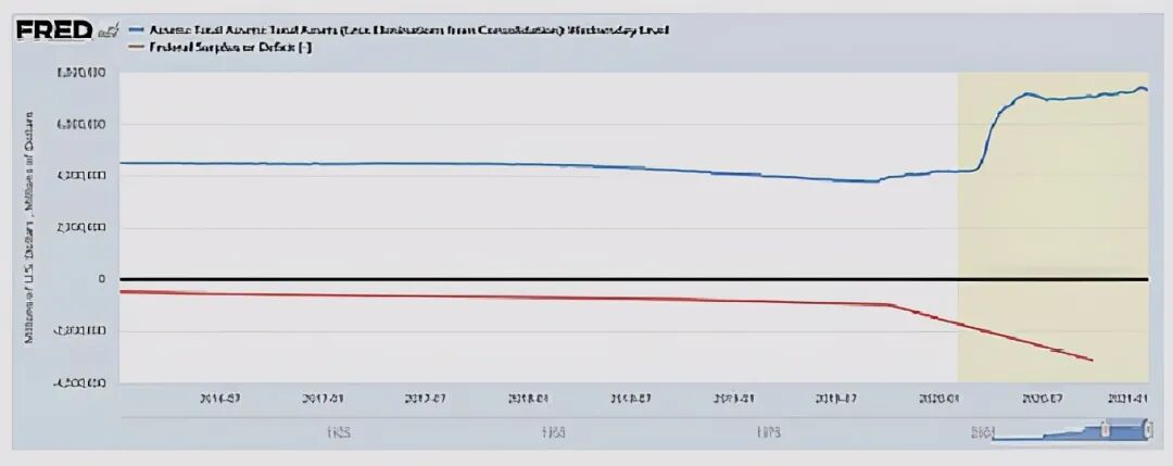 比如,仅2021年第一季度的预算赤字就接近2万亿美元,而且美国还沉迷于用美元作为限制一些经济体的工具,这将迫使全球都在思考美元在国际结算中的作用,具体数据趋势请参考下图中美联储资产负债表的急剧上升和联邦赤字的相应增长变化。