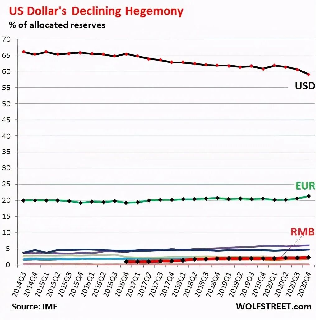 国际货币基金组织(IMF)在4月公布的全球国际储备数据显示,2020年末,美元在各国国际储备资产中的份额占比意外连续三个季度下降至25年来最低值至59%,对美国来说,这是一个相当让美联储和美财政部担忧的数字,因为在1977年至1991年期间,美元在国际外汇储备中的占比一度高达85%,而2000年时该比例还仍高达73%,这表明与1970年代相比美元在各国外储中的地位跌幅高达30%。如果按此趋势,很快会看到这个数字接近50%,所以,仅从这个角度来看,靠美债驱动的美国经济和美元故事已经讲不下去了。