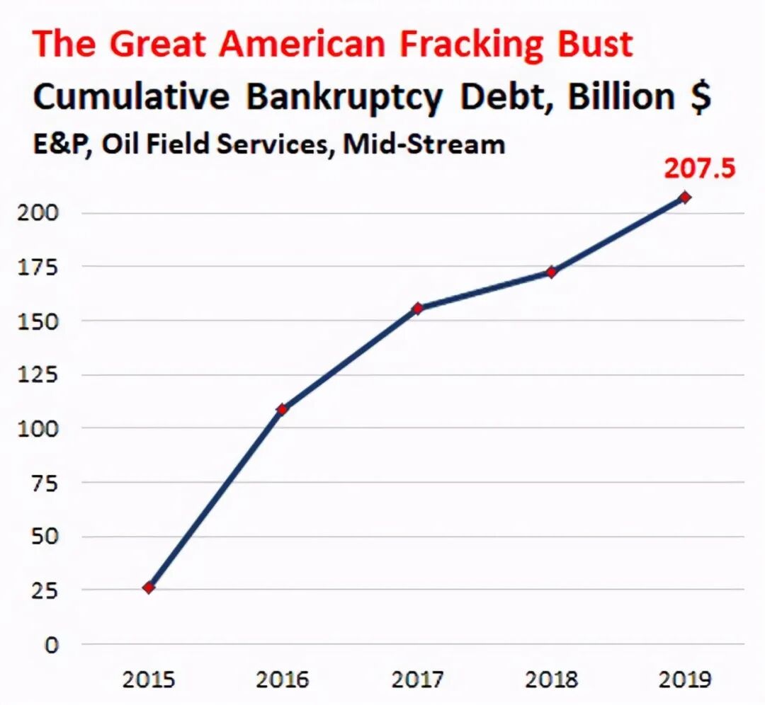 根据海恩斯和布恩律师事务所汇编的数据,2015年以来美国大页岩油气破产案总数近500起,仅2015年至2019年这些破产申请中列出的债务总额达到2070亿美元。下图显示了自2015年至2019年间,这些破产涉及的累计债务总额。