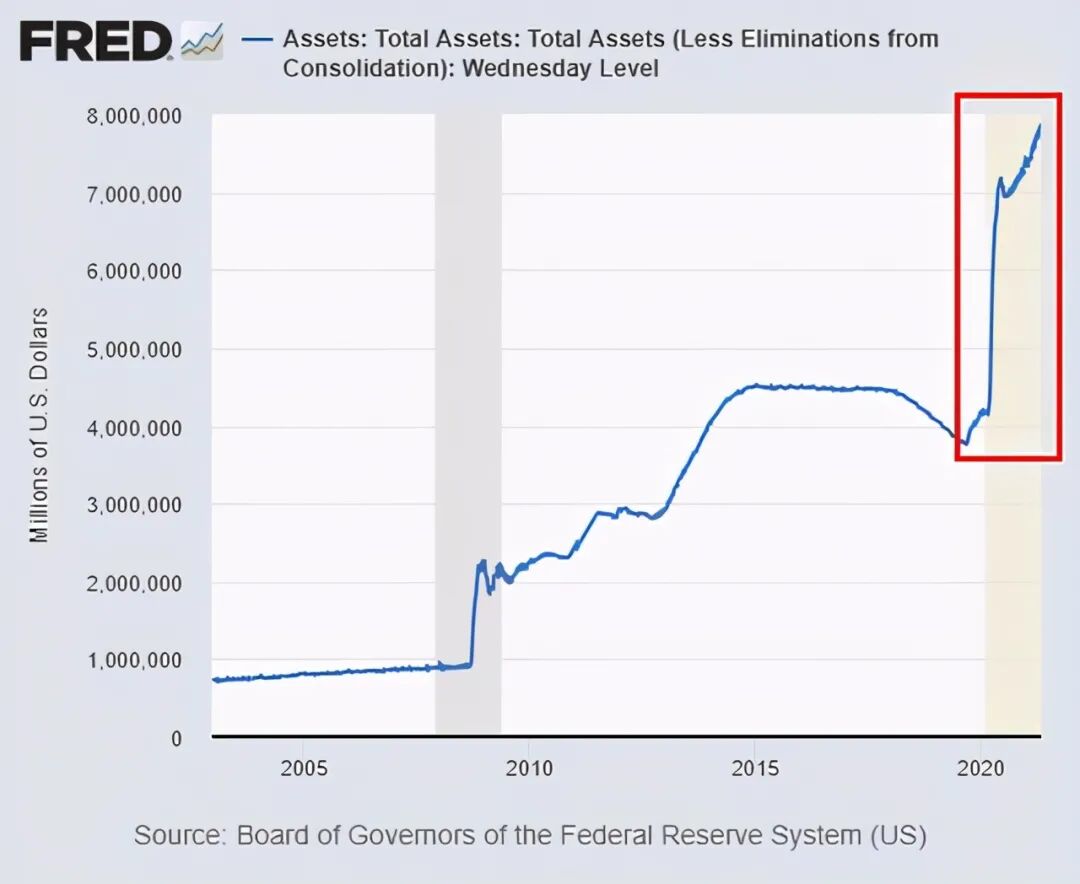 我们团队根据路透社监测、美国财政部及美联储发布的历次数据统计到,自2020年3月来,美国已经在过去的56周内总计印钞放水达30万亿美元的基础货币流动性(M1,M2,M3等)、资产负债表扩张、财政预算赤字和一揽子经济刺激方案,换句话说,一个接一个的美国天量货币化进程正将债务赤字进行货币化,下面的这根黄金区域内的直线正在完美地诠释了这个过程。那么,这将对美元和全球央行数字货币意味着什么?