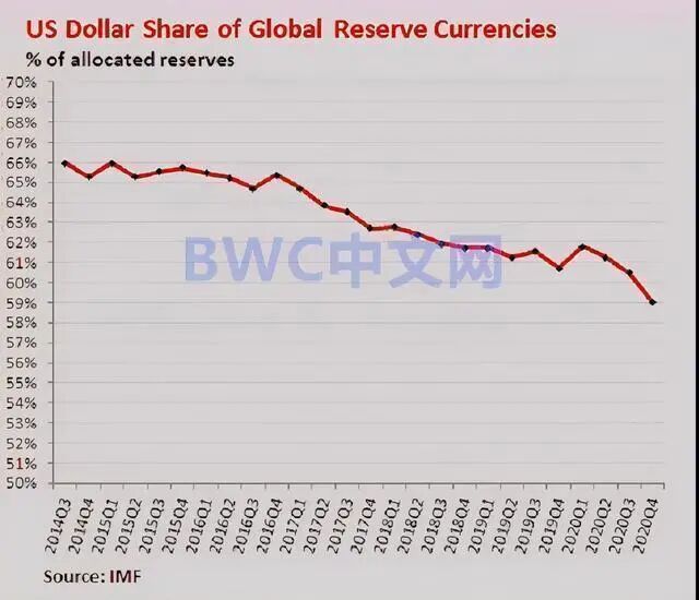 事情的新变化是,美国劳工统计局在当地时间8月11日公布的最新数据显示,美国7月份CPI同比上升5.4%(与6月持平),超过市场预期(为5.3%),尽管涨幅看似有所缓解,但依然是2008年金融危机以来最快的。另据环球银行金融电信协会(SWIFT)数据显示,5月在全球支付货币占比中,美元已跌至38.35%,被欧元39.03%超越。此外,据国际货币基金组织(IMF)数据,美元储备在世界储备货币的份额已经下降至59.02%的历史低点,如下图。 在过去的六年中,美元所占的份额以每年约1个百分点的速度下降。这进一步表明,美联储毫无节制开启美元印钞机,正在将美元推向渐渐失去储备地位的不归路。而在这一过程中,全球多国开启了用主权加密货币的方式而去美元化的进程。