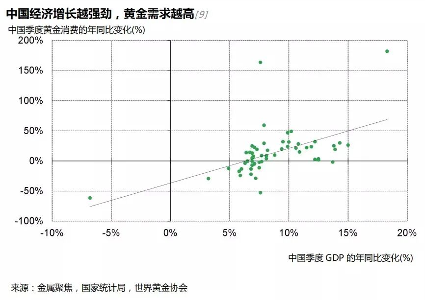 据中国央行数据显示,截至2021年7月底,中国拥有的黄金储备为1948.3吨(数月以来一直没有变化),占到外储总份额的3.3%,而美国和德国所拥有的官方黄金储备在国际储备资产中的占比分别高达78%和75.2%,再考虑到中国的经济总量与美国之比,所以,中国的黄金储备量还有相当的差距,这也为接下去继续增加黄金提供足够空间,下图体现了中国的黄金消费和国家的经济实力之间存在着正向关系。