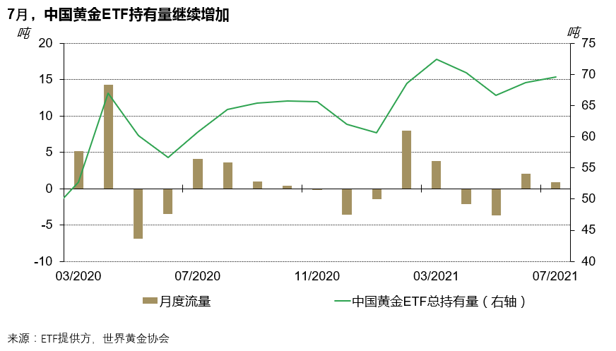 据世界黄金协会在8月20日公布的报告显示,7月,上海黄金交易所Au(T+D)交易量和上海期货交易所黄金期货的交易量分别为532吨和3,462吨,截至7月底,中国黄金ETF持有量总计69.6吨,继续环比增加0.9吨。截至8月19日,8月国内黄金ETF再度出现净流入,约4吨左右,远高于前两月的净流入水平。