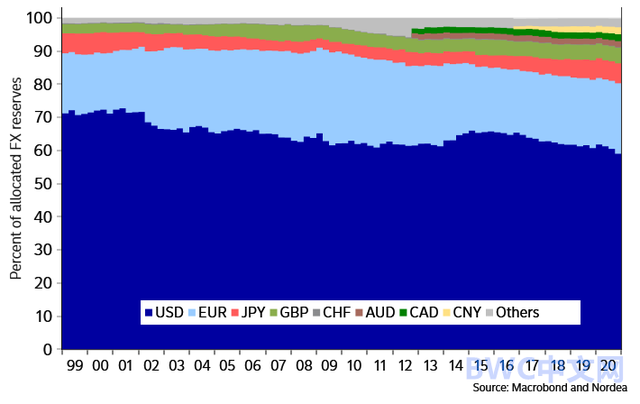 但是现在情况发生了很大变化,据IMF在7月公布的全球国际储备数据显示,2021年第一季度美元在各国外储中的份额占比意外下降至25年来最低至59.4%,值得一提的是,2000年时该比例还高达73%,如果按此趋势,很快会看到这个数字接近50%。